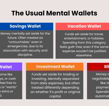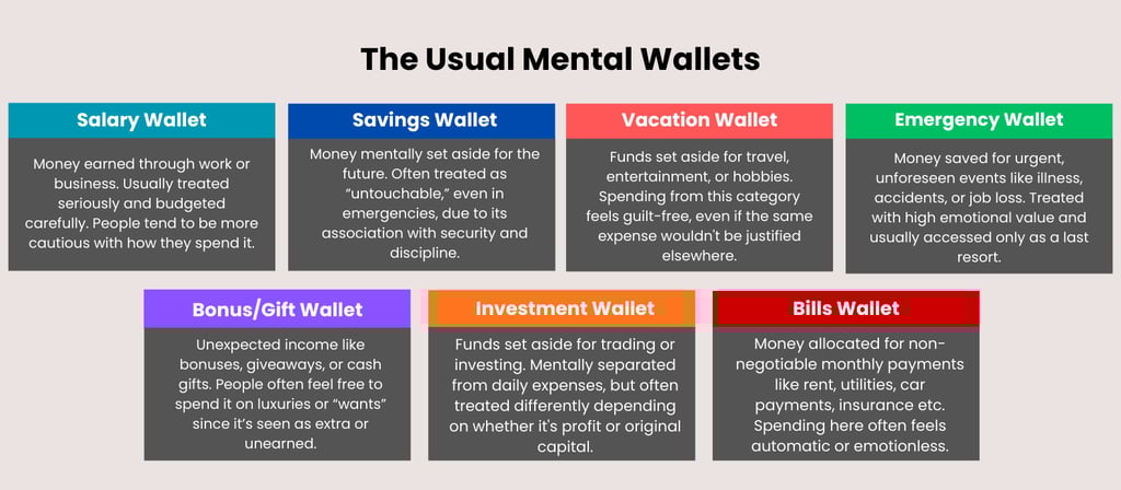 We do not just have one mental wallet. We have many. Even if all of these are technically “our money,” we behave as if each category follows different rules.